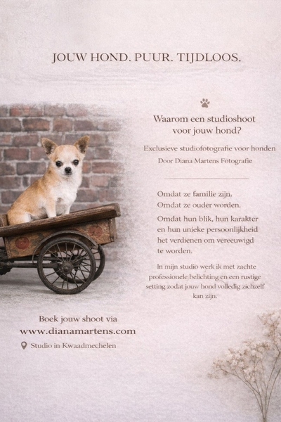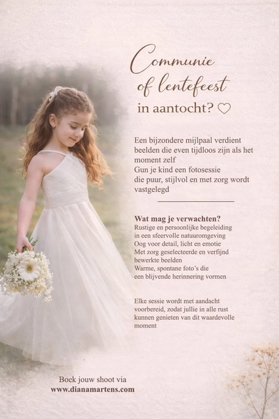 Diana Martens Fotografie, gevestigd in Kwaadmechelen, staat voor hoogwaardige fotografie met een persoonlijke aanpak. Met ervaring, passie en oog voor detail leg ik bijzondere momenten vast die een verhaal vertellen. Van portretten en communies tot familie- en bedrijfsfotografie: samen creëren we beelden waar je écht tevreden van bent.